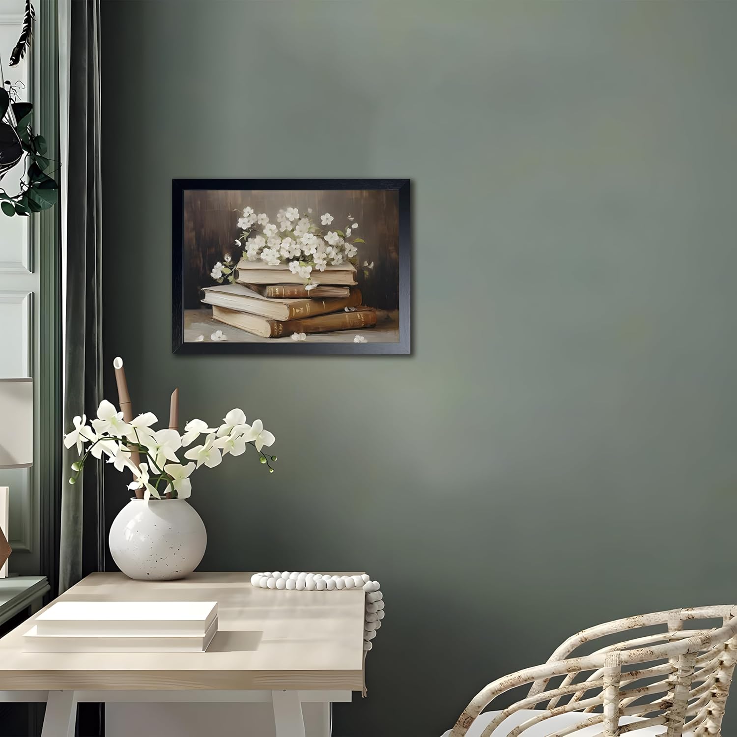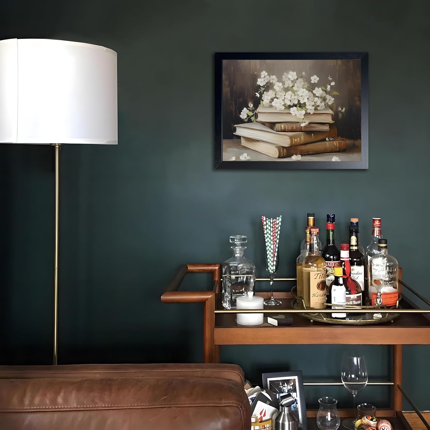 Wood Framed Canvas Poster Print Wall Art, Vintage Floral Book Wall Decor Oil Painting, Dark Academia Room Aesthetics Picture for Bathroom Classroom Dormitory room Decor 16x24 inch