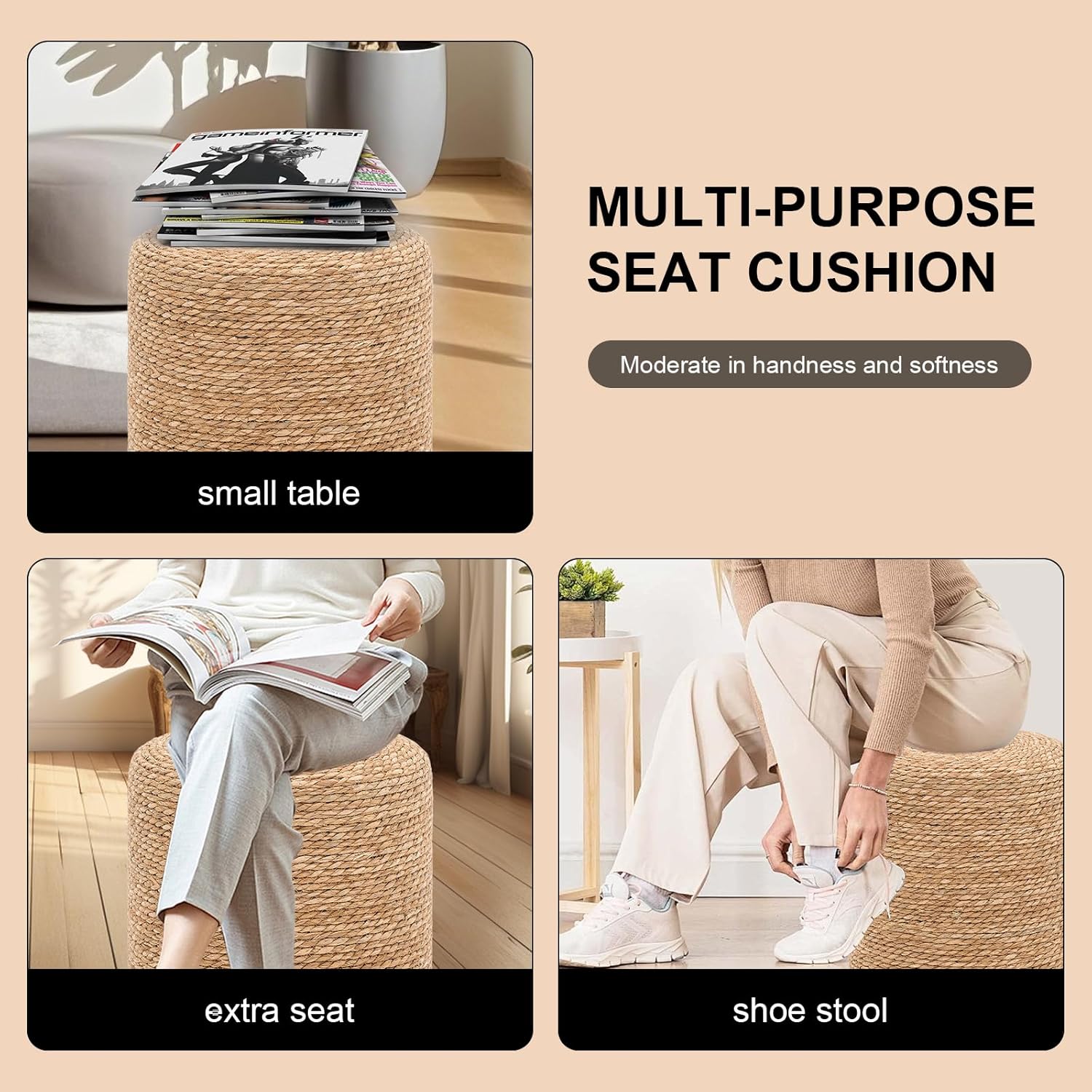 - Quality Material and Craftsmanship: experience unmatched comfort and durability with our boho stool; They feature a robust solid wood frame that provides excellent support, paired with seagrass material, carefully hand woven, offering a good blend of strength and longevity, can hold up to 350 pounds; These materials are designed to withstand the test of time while retaining its aesthetic appeal.