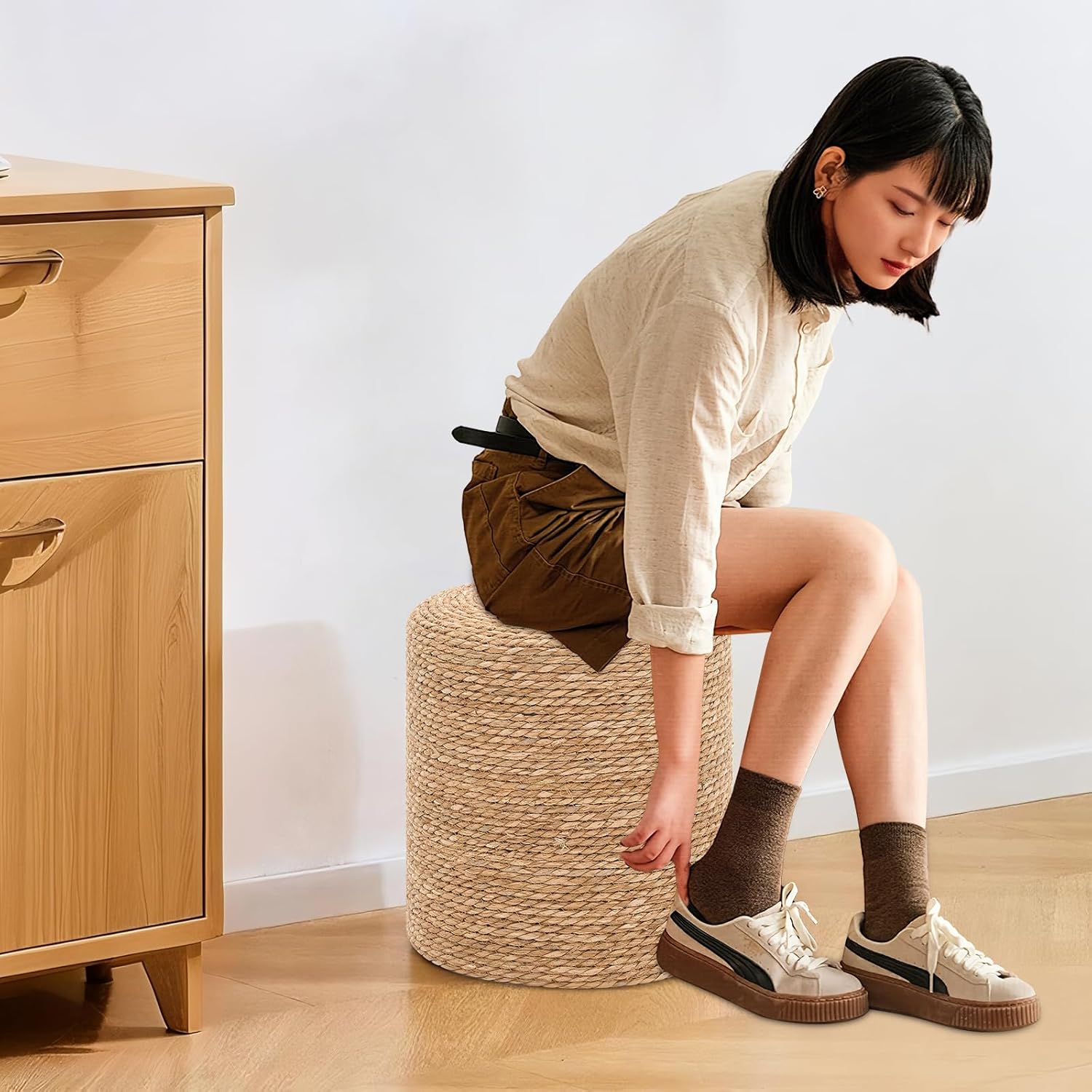 - Artisan Appeal: Handwoven with precision, each piece highlights the unique variations of natural materials, due to natural factors such as sunlight exposure, these stools may have slight differences