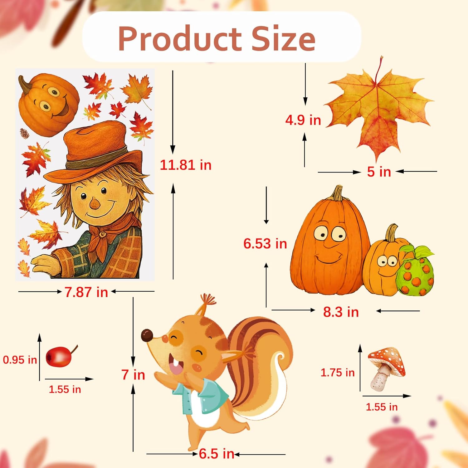 - 🎃What you will get: you will get 12 sheets fall themed static window clings, totally 153 pcs parts of autumn window stickers. 11.87*7.87 inch every sheets, and different size of every part. There are large size pumpkin, scarecrow, truck, maple leaves and tree, fox, squirrel, etc.