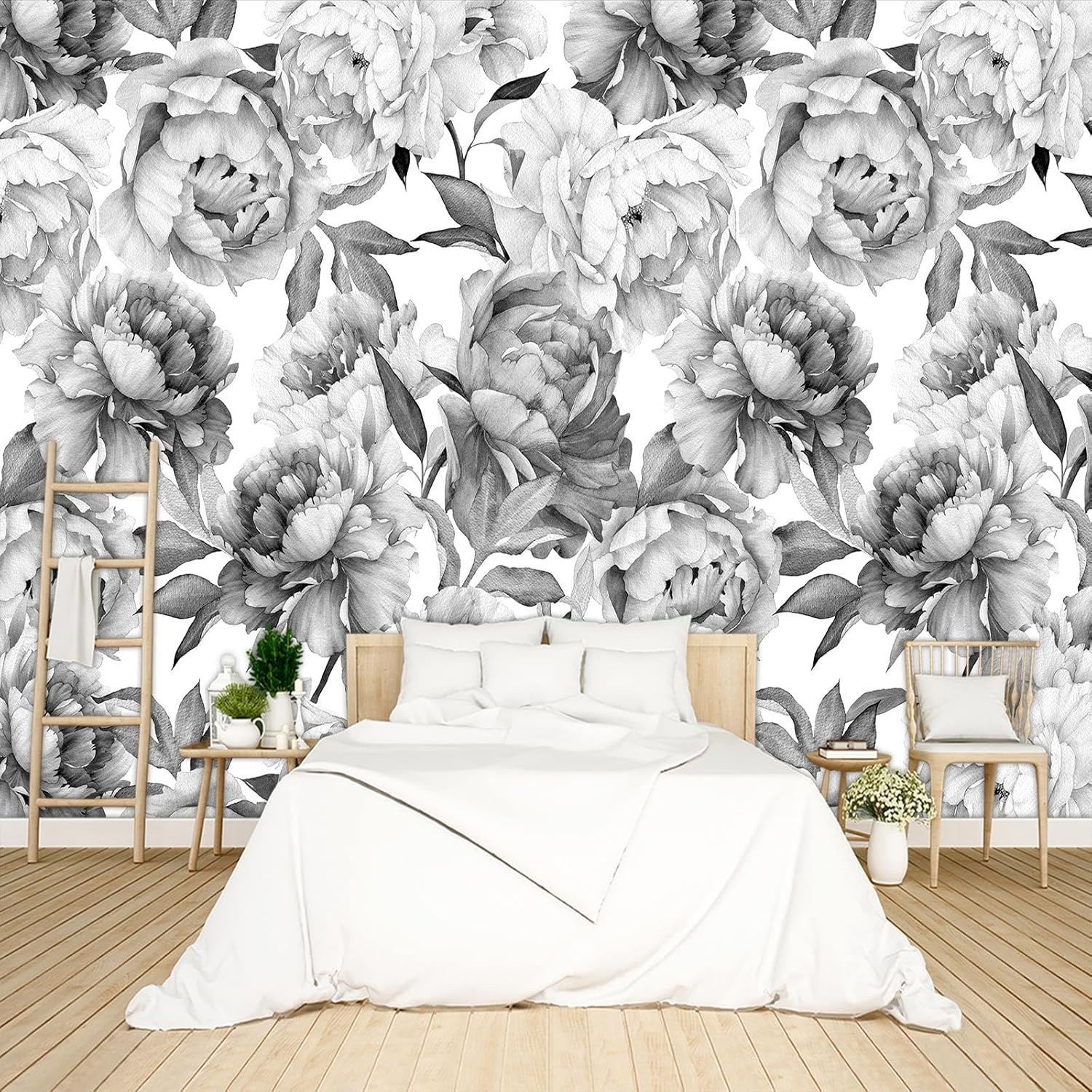 Grey Peony Floral Wallpaper Peel and Stick Wall Mural for Bedroom Living Room - 85"x118"