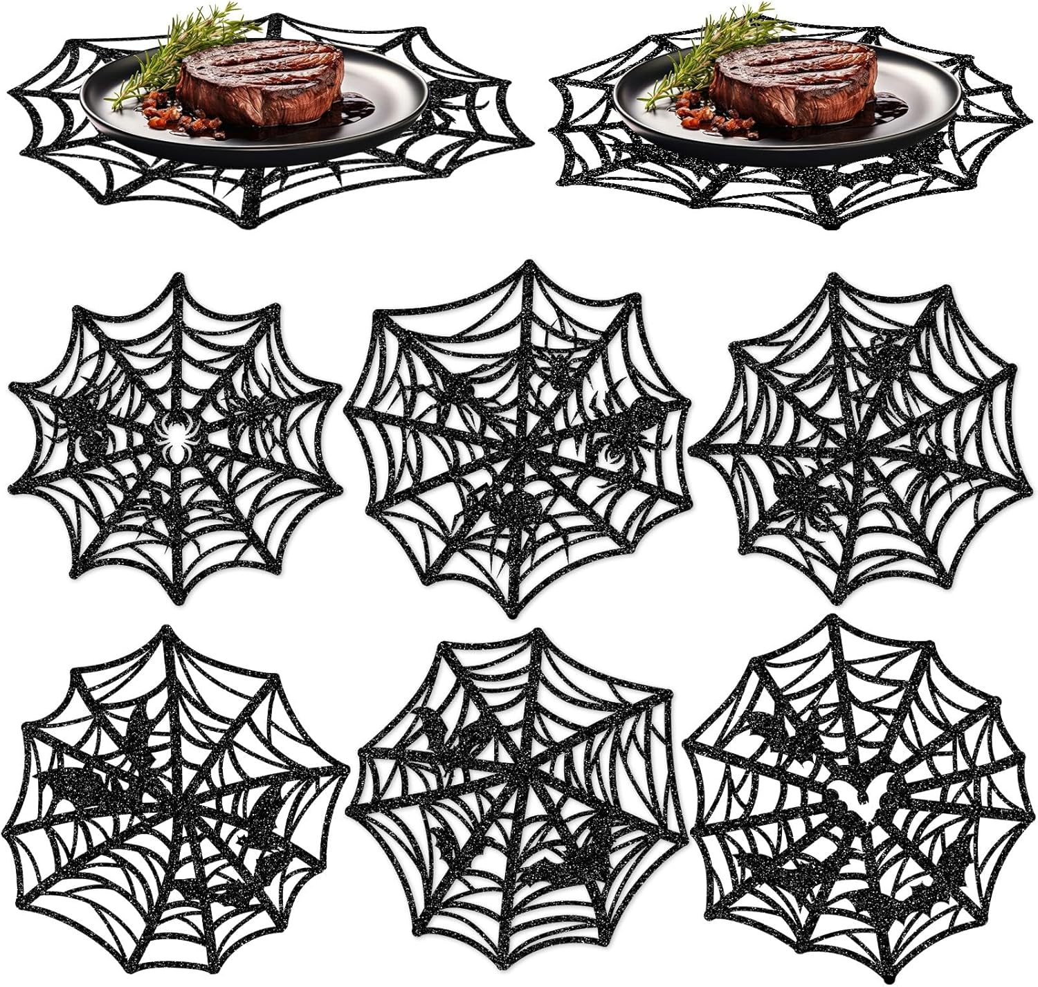 - SPIDER WEB DESIGN: Shaped in spider web of different styles, colored in glitter black, sophisticated and dazzling, to create whimsical and spooky Halloween vibes for your kitchen decor