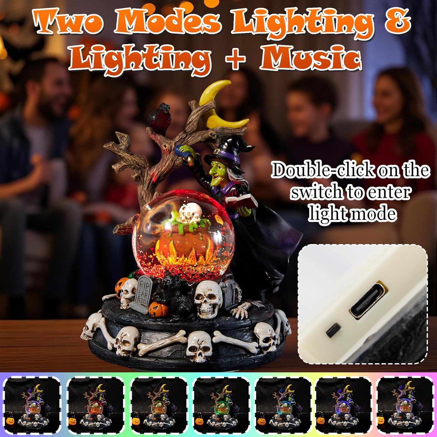 - 🎃【 Halloween Snow Globes 】 This beautifully detailed, lighted snow globe features hand-carved Halloween designs. 6 x 6 x 8 inch snow globe depicts a witch casting spells over a cauldron under moonlight, holding a potion vial and spellbook. The scene is surrounded by a black cat, raven, skull, tombstones, and pumpkins. The crystal ball is installed on a black base with a retro and mysterious carving, on which skeletal figures are engraved, exuding a truly strange atmosphere.