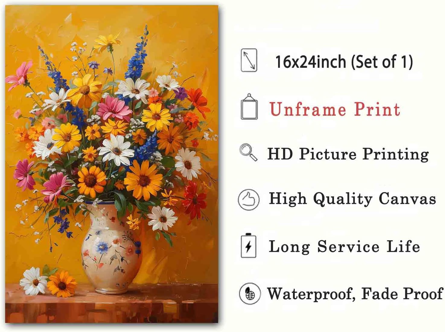 - 1.Canvas wall art specifications:Size:16X24inch,frameless,high-definition canvas wall art prints,printing pictures on canvas,using high-quality environmentally friendly ink,not easy to fade. The colors are beautiful and shiny,high-definition Giclee modern canvas print artwork.