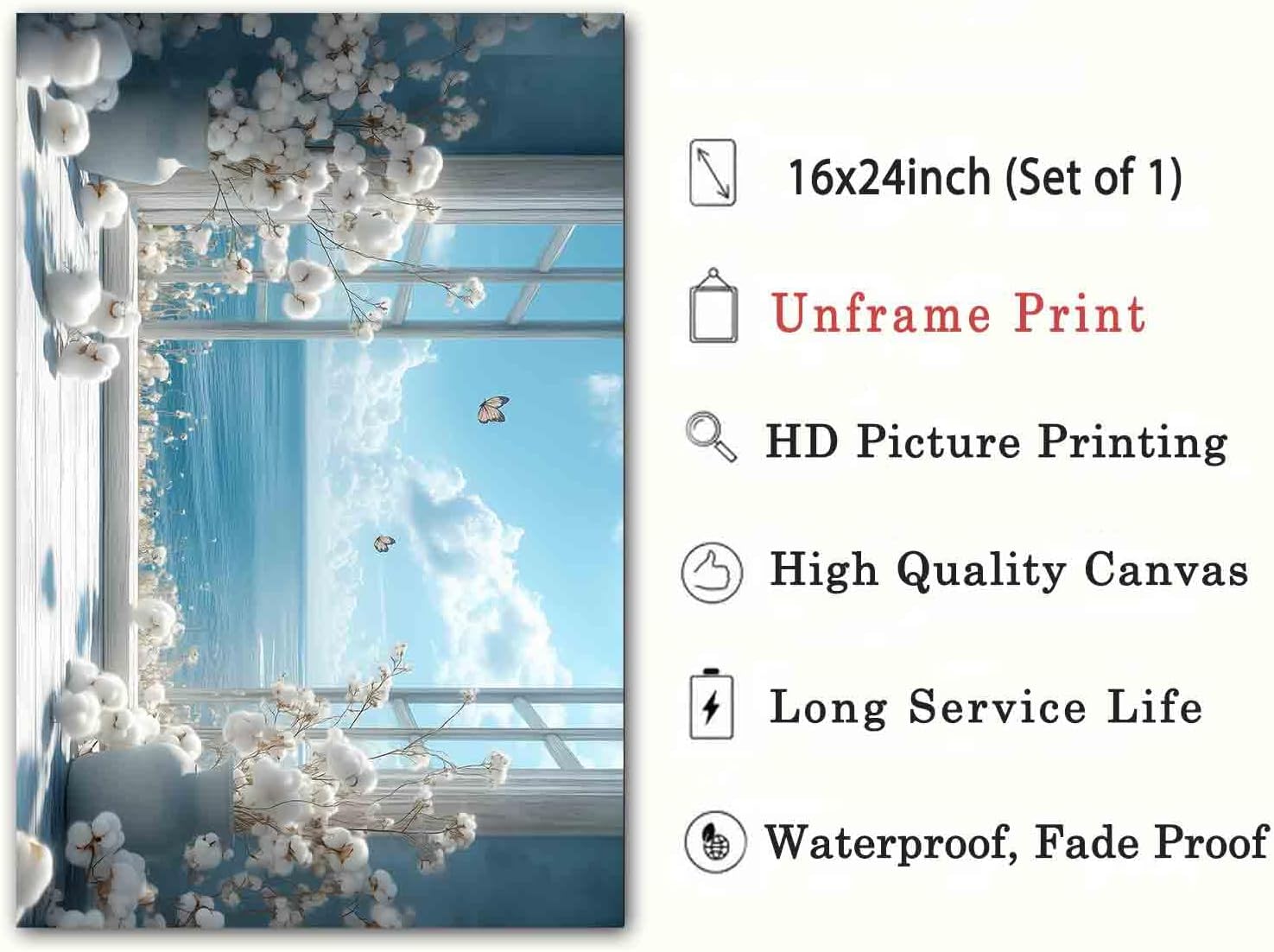 Open Window Canvas Wall Art Cotton Bouquet Wall Art White Flower Painting Blue Sea Picture Coastal Flower Painting Still Life Pictures Relaxing Living Room Decor 16x24inch No Frame