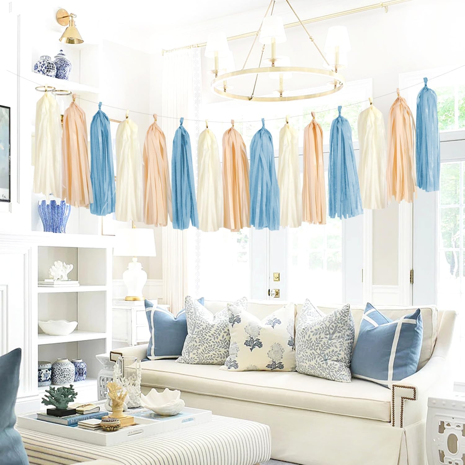 - 【Garland includes】15tassels,5pcs beige tassel garland, 5pcs duty blue tassel garlands, 5pcs champagne gold garlands. Each tassel is about 14" long after assembled. And each garland comes with a 10ft long free String for hanging these tassels.