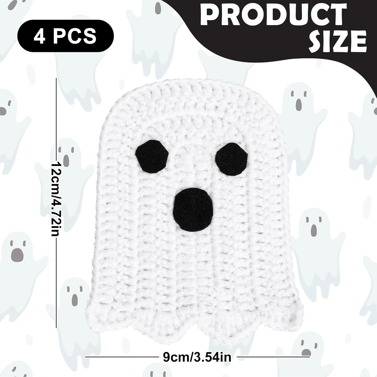 Whaline 4Pcs Halloween Ghost Coasters Handmade Crochet Drink Coasters Woven Fabric Cup Mat for Home Kitchen Party Table Decor