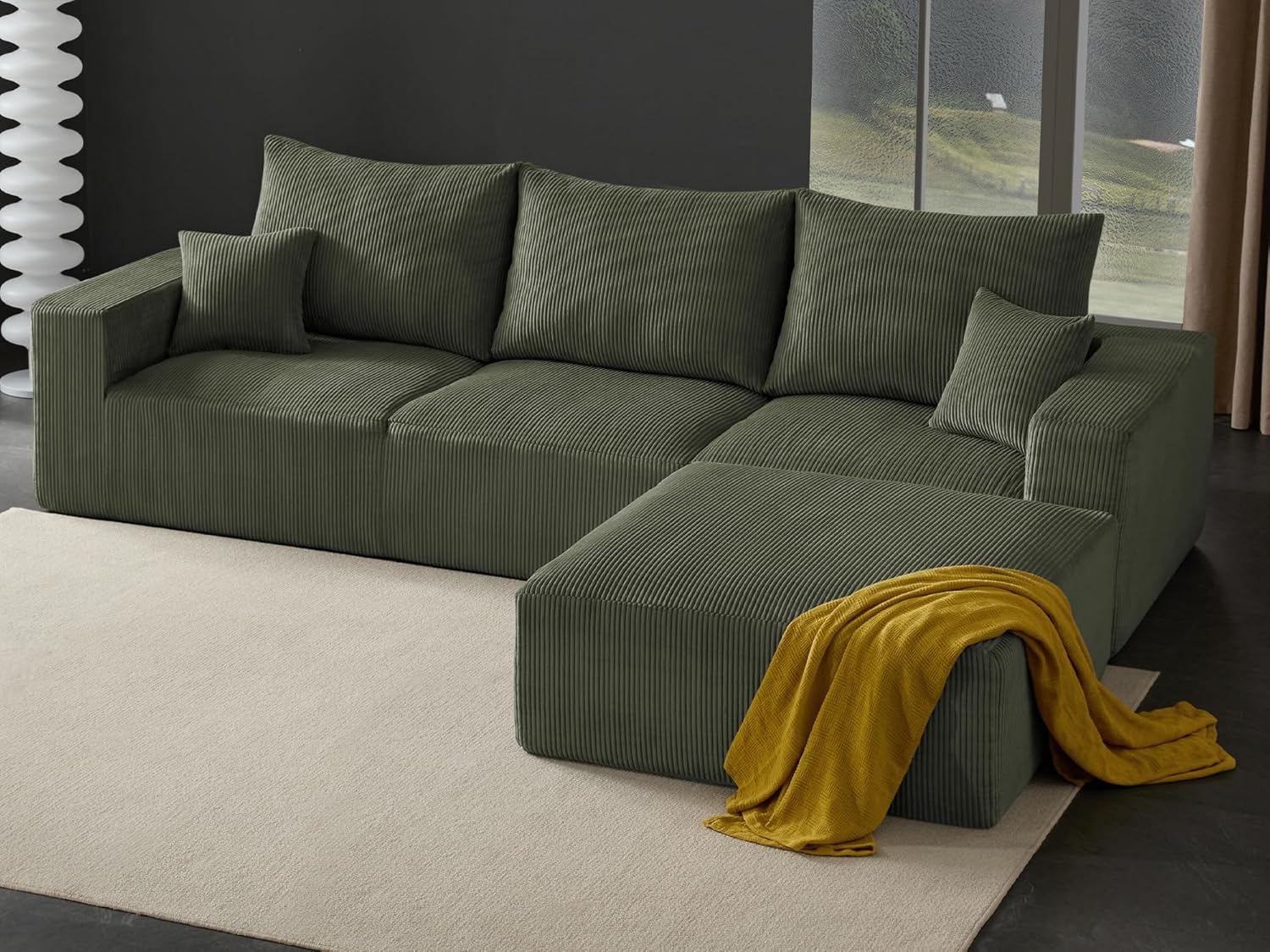 Boneless Sectional Cloud Couch Sofa for Living Room, 112" L-Shaped Modular Modern Lounge Sleeper Green Couches with Chaise, No Assemble, Cordury Compression Upholstered Sofas
