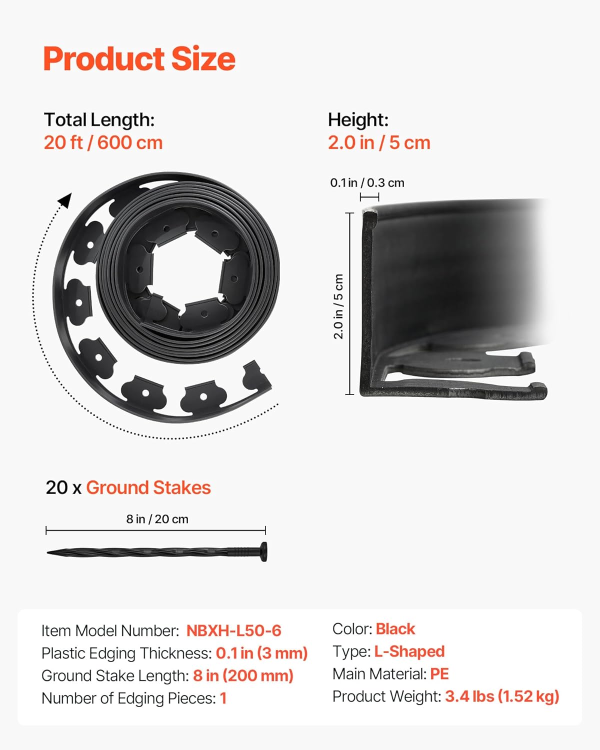 - 20 ft x 2 in Garden Edging: This 20 ft flexible landscape edging strip is ideal for small flower beds or mini green spaces. At 2 in high, it clearly separates garden beds from lawns or gravel paths.