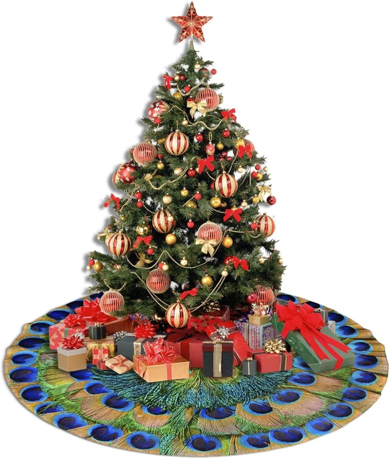 Christmas Tree Skirt,Peacock Feathers Circle Xmas Tree Skirt Rustic Farmhouse Tree Skirt for Christmas Decor Xmas Holiday Home Party Decorations36