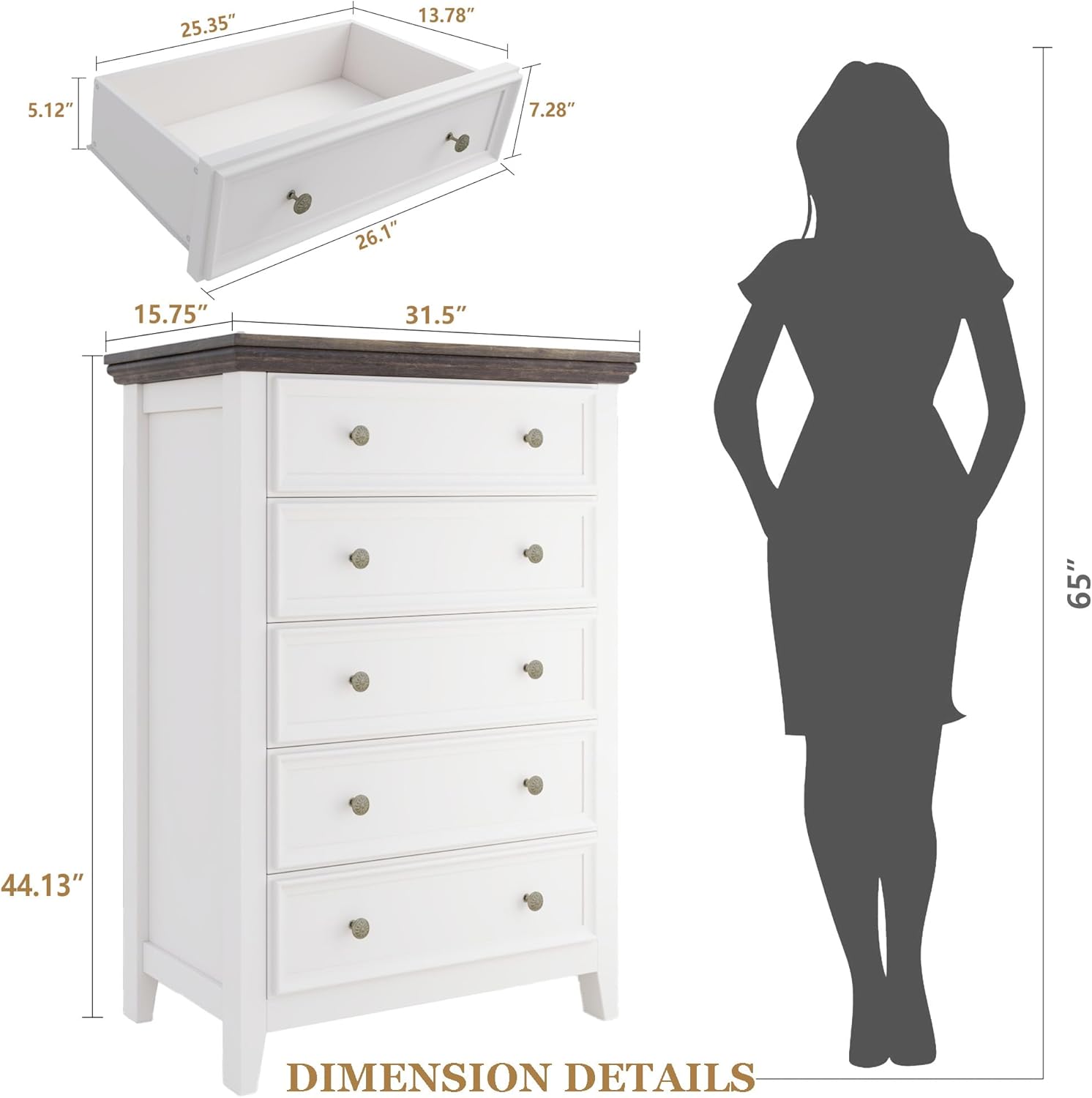 • Modern Farmhouse Style: The modern 5 drawer dresser is clean White finish with vintage-style metal knobs and crisp vertical/horizontal lines creates a minimalist look. Seamlessly complements modern, industrial, or traditional decor schemes.