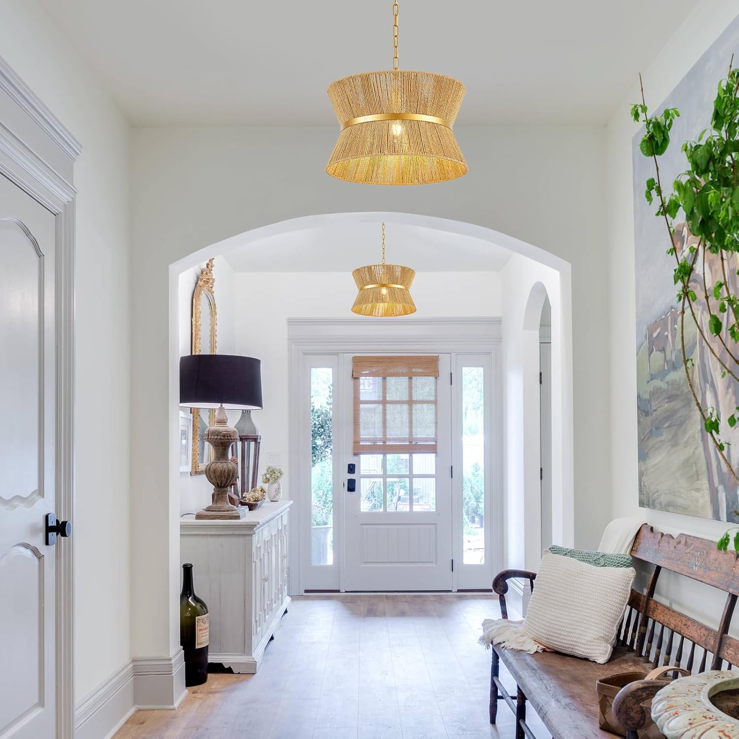 18” Hand Woven Rattan Boho Chandelier Brass Ajustable Pendant Light for Kitchen Island Living Room Bedroom Hallway, UL Listed
