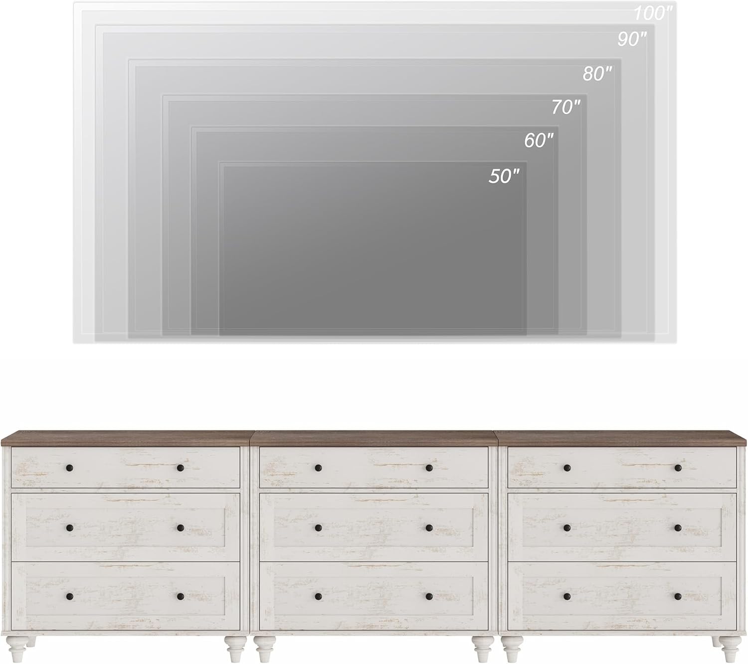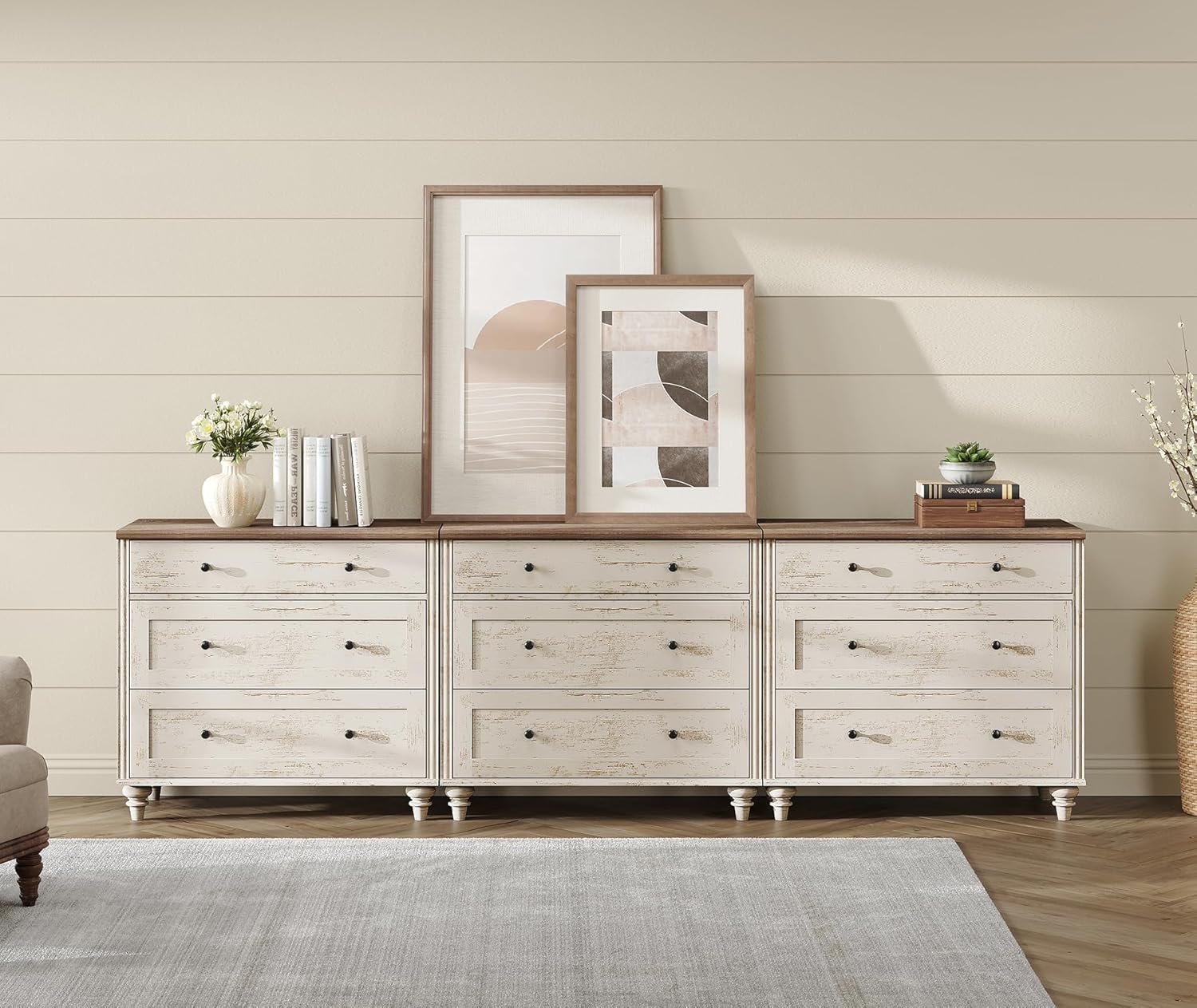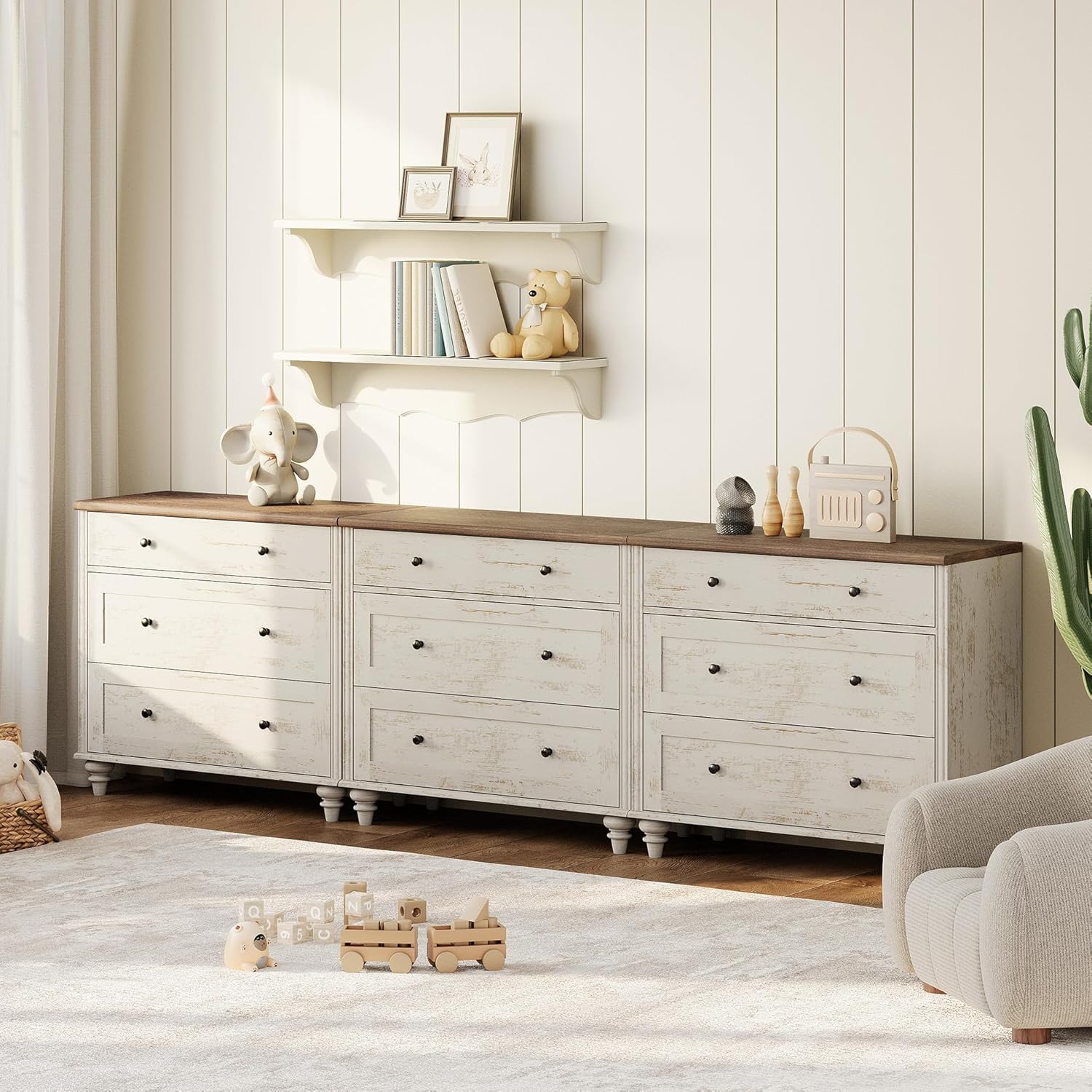 • 【3-in-1 Multipurpose Dresser】The large dresser can be used together as 9 drawer dresser or tv stand for 100 inch tv, or used separately as 3-drawer dressers.With distresser suface is very classic and elegant which blends in easily with any decor. It is ideal as a baby dresser, kids dresser and console table, etc.
