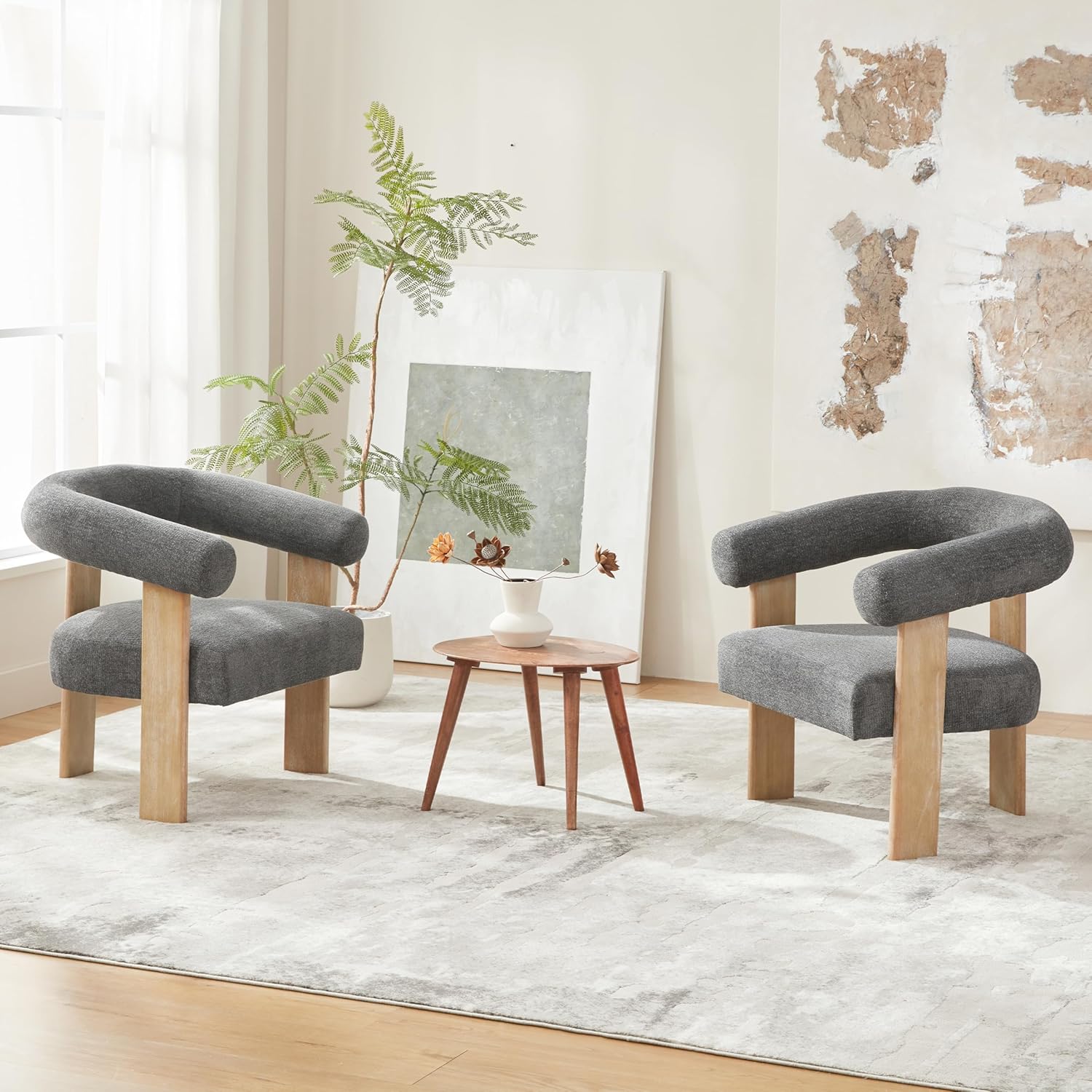 VKNOW Accent Chair Living Room Chair Set of 2, Modern Upholstered Armchair with Solid Wood Legs, Comfy Barrel Arm Chairs for Living Room Bedroom, Dark Grey