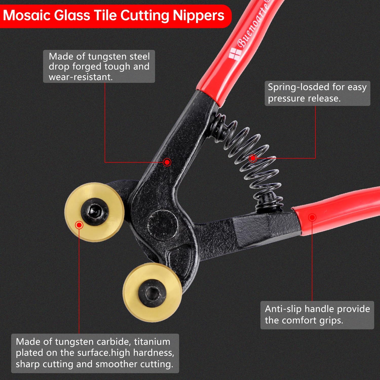 - Soft-Grip Handles: Ergonomic Soft-grip non-slip handles makes mosaic glass work effortlessly. High leverage design for maximum gripping strength. The spring action reduces hand and wrist fatigue for easy tiling project