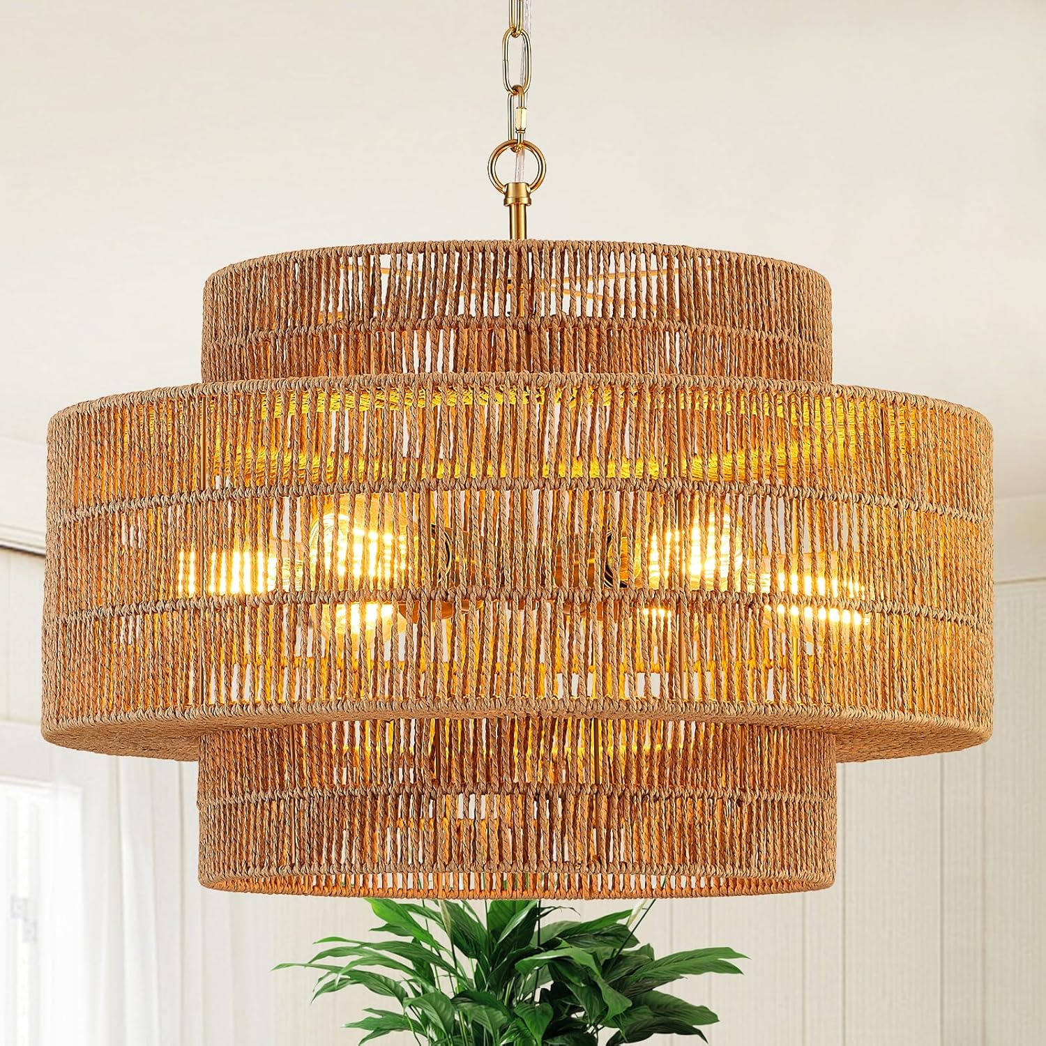 • 【3-Tire Design】The 3-tier rattan chandelier's simple wicker weave and golden finish metal frames bring a vintage bohemian style. This farmhouse chandelier light fixture features three round metal frames that form a captivating semicircular hollow cage. This design sets it apart, adding an element of sophistication.