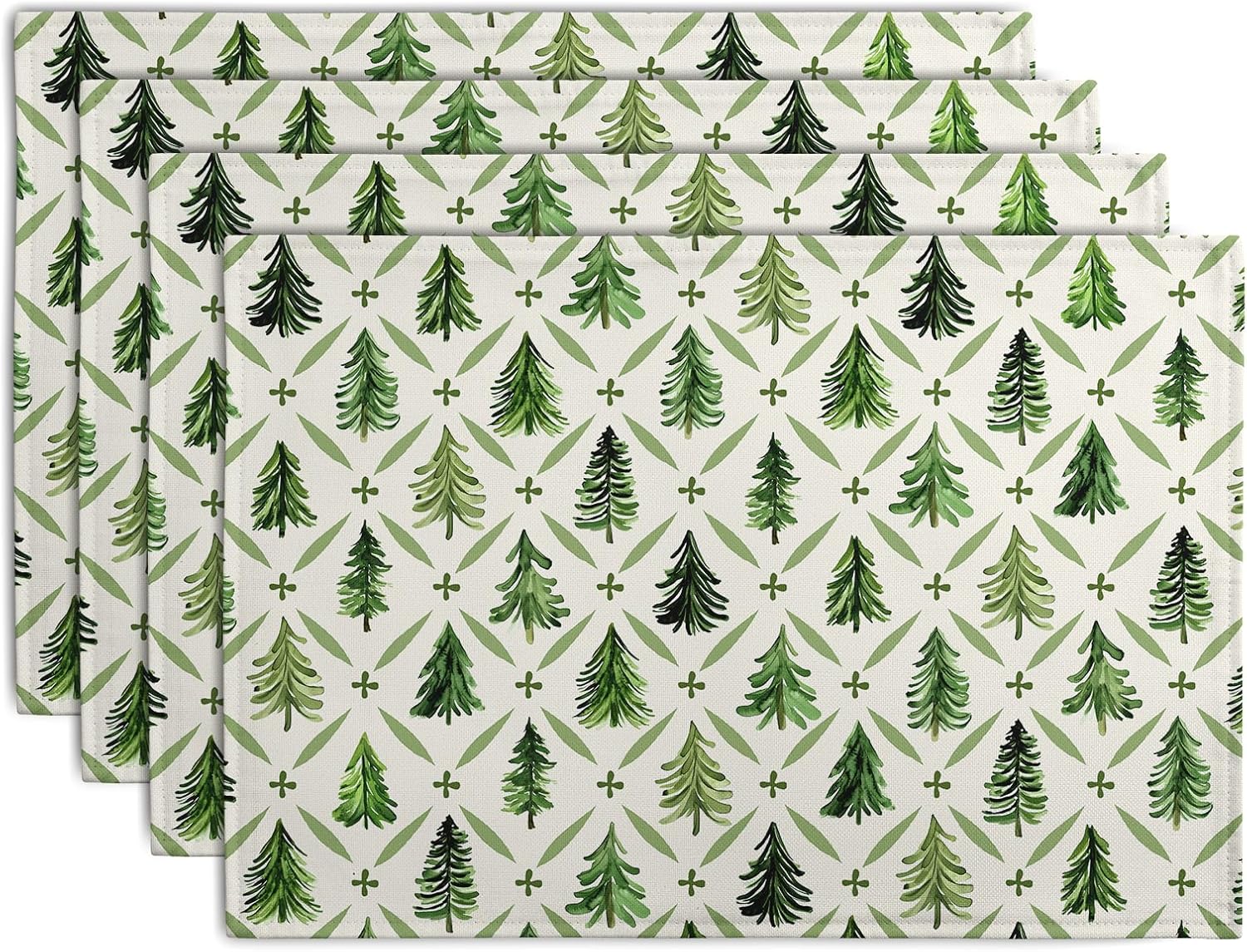 Sage Green Pine Tree Christmas Placemats Set of 4 Xmas Farmhouse Rustic Style Print Place Mat Seasonal Winter Holiday Linen Table Mats for Indoor Outdoor Kitchen Dining Party Decor