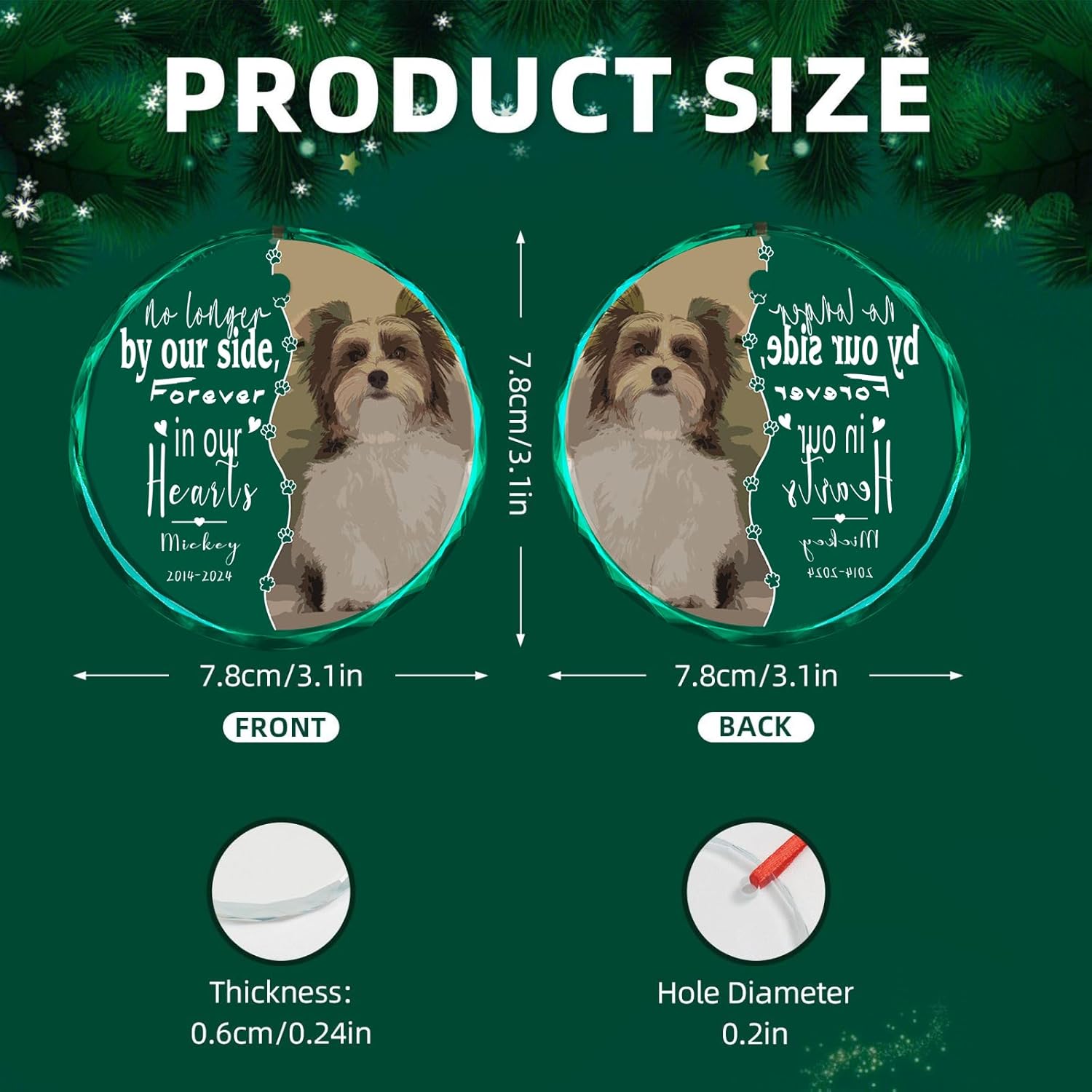 - The Perfect Sympathy Gift Choice – This custom glass ornament featuring your pet’s photo, name, and dates is an ideal tribute for a departed dog, cat, or beloved companion. Gazing at its glass pendant will make it feel like they’re still by your side.