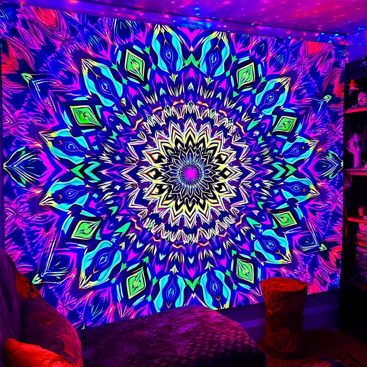 PSYHILAR Blacklight Mandala Tapestry for Bedroom, Medium Black Light Posters for Adults and Teens, Colorful UV Reactive Aesthetic Bohemian Wall Art Decor (60 x 50 Inches)