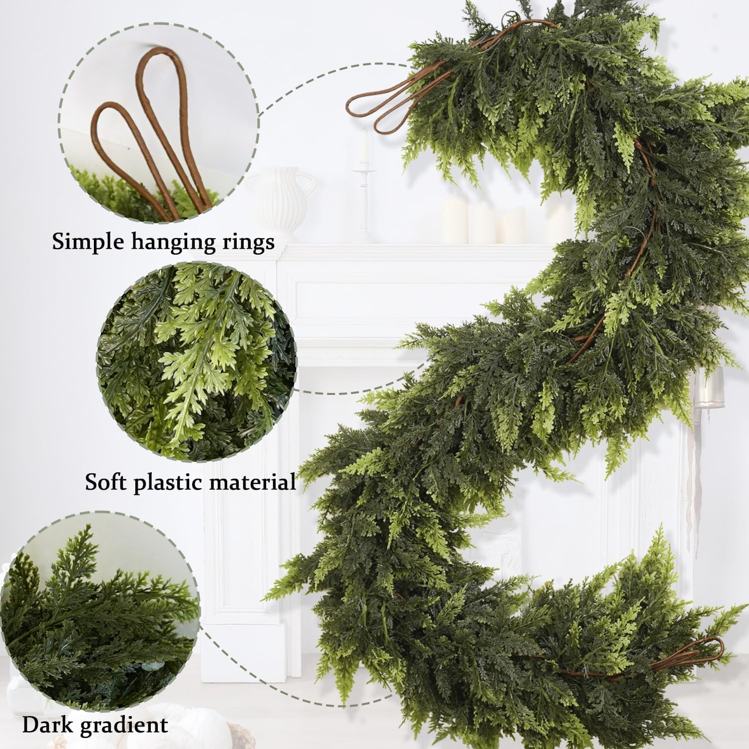 - 【Lush, Thick & Realistic Feel】Crafted with high-quality materials, this cedar pine needles garland offers an ultra-soft, lifelike texture that feels like genuine cedar. The full, dense foliage drapes beautifully, adding a fresh and festive atmosphere to your home, whether displayed on a mantel or hung across walls
