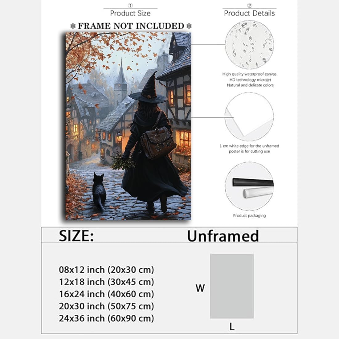 Autumn Witch And Black Cat Picture Wall Decor,Halloween Canvas Vintage Rustic Wall Art,Preppy Bedroom Living Room Bathroom Poster Print,20"x30" Unframed