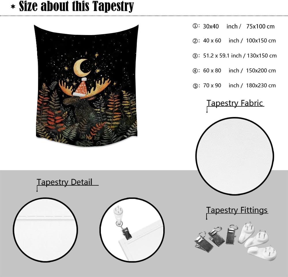 Cute Moose Tapestry Winter Christmas Aesthetic Wall Hanging Decor Funny Animal Lover Gift Whimsical Christmas Tapestries for Nursery Kids Bedroom Home Living Room Decoration 70x90inch