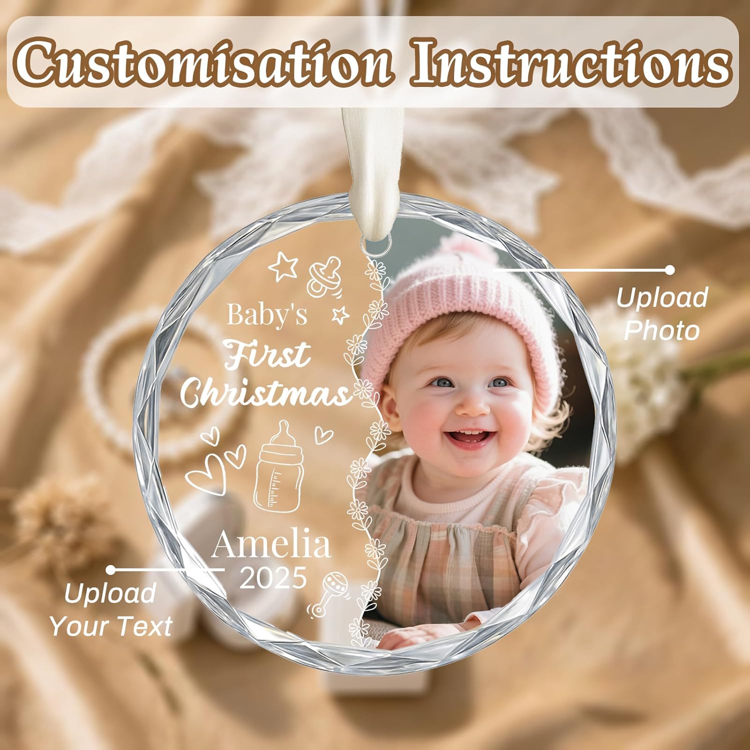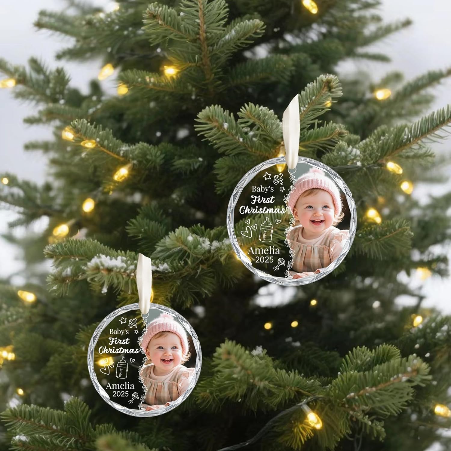 Personalized Baby's First Christmas Ornament 2025, Custom Christmas Photo Crystal Glass Ornaments with Name or Date, Personalized Christmas Tree Decor Gifts for Family, Friends,Pet or Baby