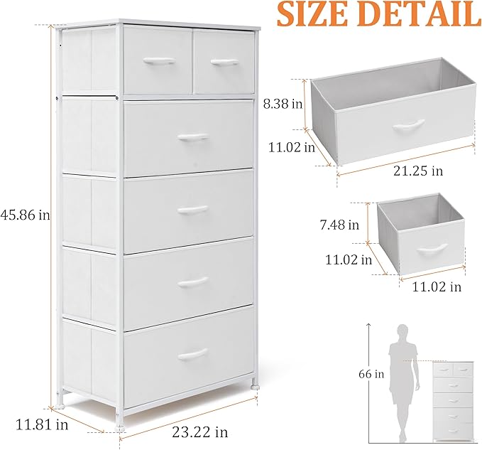 - Large Storage Capacity: The dresser chest of drawers provides ample space with 6 separate drawers to easily fit into smaller spaces, suitable for any place where you prefer to organize items. Overall Dimensions: 23.2" L x 11.8" W x 45.8" H. Each Small Drawer : 10.8ββ L x 11.8ββ W x 7.7ββ H; Each Large Drawer :21.2ββ L x 11.8ββ W x 8.5ββ H; The drawer is perfect for organizing clothes and other accessories.