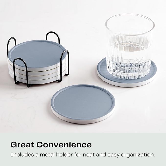 Set of 6 Dusty Blue Coasters with Holder, Absorbent Ceramic Drink Coasters with Cork Backing for Table Protection, Table Decor, Housewarming Gifts