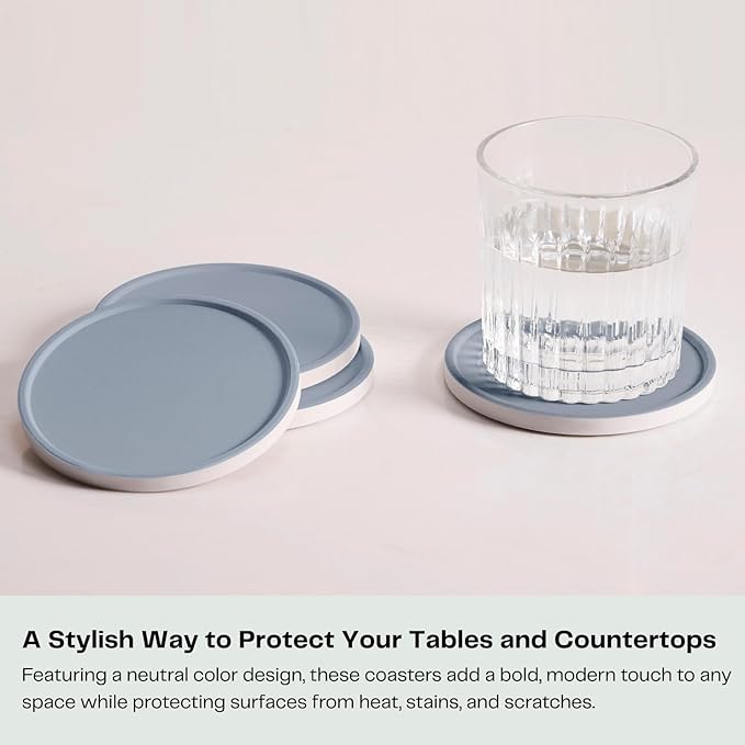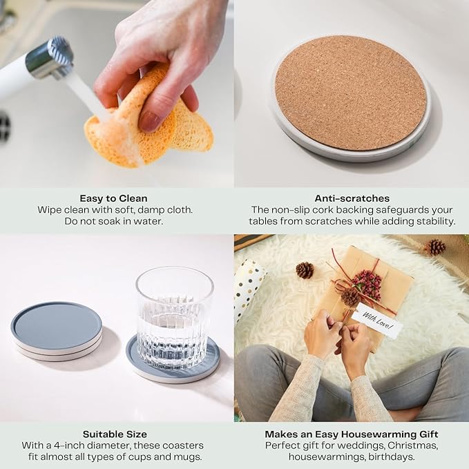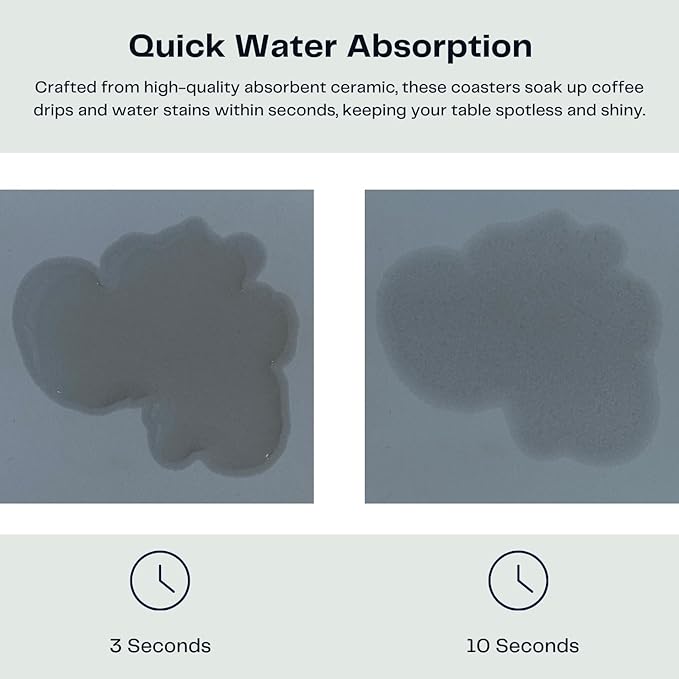 - Quickly Absorbs Spills – Crafted from premium absorbent ceramic, these coasters soak up water rings and coffee drips within seconds, keeping tables spotless. Each coaster features a cork backing to protect surfaces from scratches and prevent sliding.