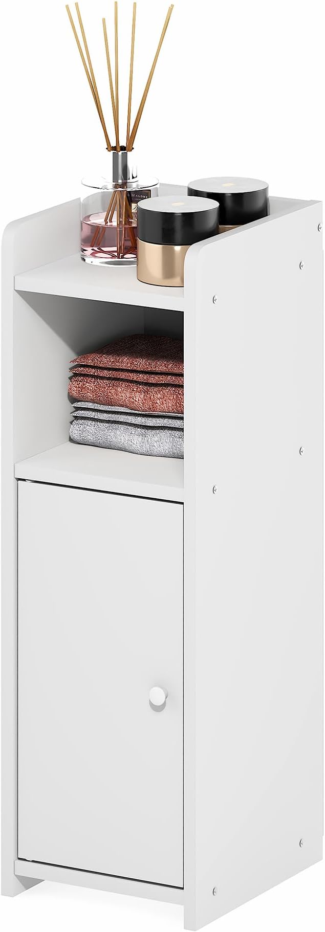 - SLIM CUBE-SHELF PROFILE: This narrow cabinet uses a closed back and cube-shelf styling with a door cabinet that fits neatly in bathroom, living room, or entryway, so the bathroom storage cabinet keeps essentials close without crowding tight corners; the top open shelf with side rails helps keep daily items from sliding, making it a smart small space choice